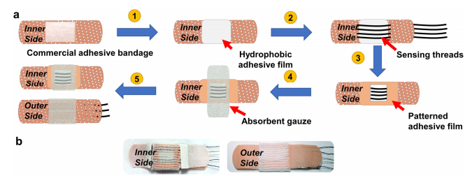 The patch device created by the Tufts engineers performs real-time measurements of important biomarkers present in sweat including sodium and ammonium ions (electrolytes), lactate (a metabolite) and acidity (pH).